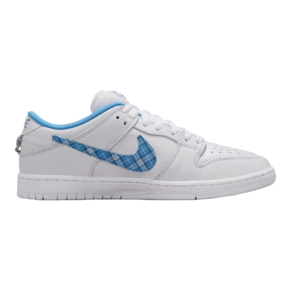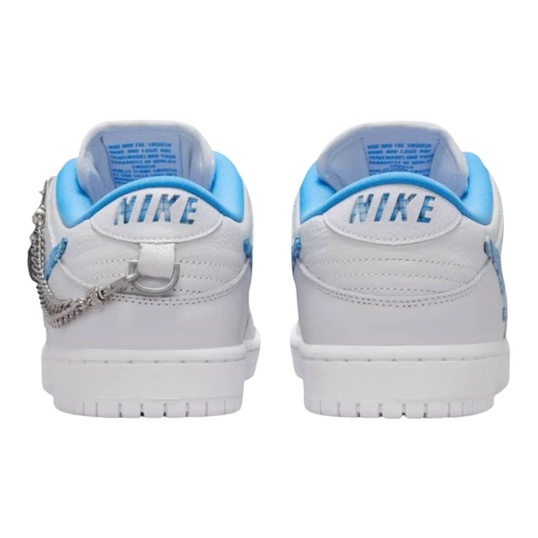 The Nicole Hause x Nike Dunk Low Pro SB 'White University Blue' dons a white tumbled leather upper with a floating blue plaid Swoosh. Each mesh tongue alternates between a Nike SB and Nicole Hause logo. A detachable chain adorns the left shoe, while the insoles showcase a fine-line graphics nodding to Hause's passion for birdwatching. A white rubber cupsole completes the look.